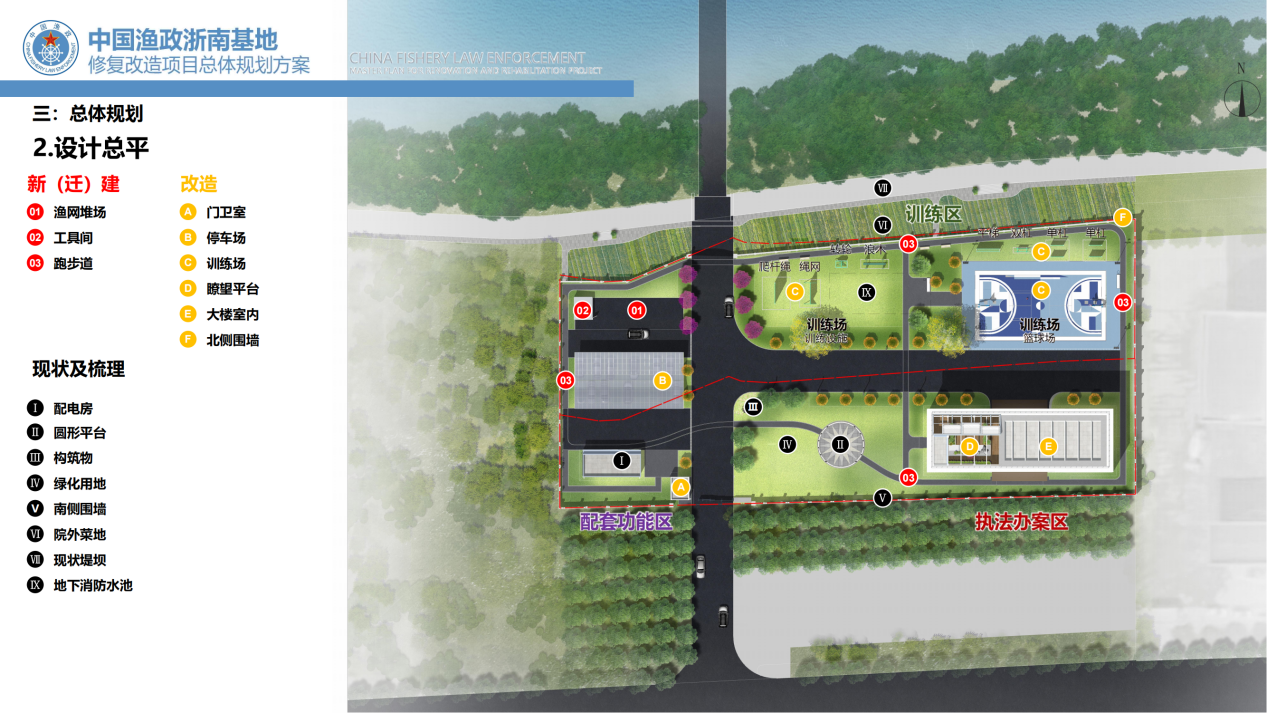 該項(xiàng)目位于溫州海洋經(jīng)濟(jì)發(fā)展示范區(qū)(靈昆島),工程建設(shè)用地3230平方米,總建筑面積1642平方米,其中漁政管理用房1559平方米,配電房63平方米,門衛(wèi)室20平方米,總投資約550萬元。項(xiàng)目通過完善基地配套基礎(chǔ)設(shè)施,解決基地年久失修、地基沉降、功能不全等問題,同時(shí)改善大院空間布局,滿足基地人員辦公、訓(xùn)練、執(zhí)法辦案、船艇靠泊等需求,提升基地在維護(hù)浙南漁場(chǎng)秩序,加強(qiáng)漁船安全管理的綜合保障能力,從而更好地適應(yīng)海洋與漁業(yè)執(zhí)法的新形勢(shì)新要求。
